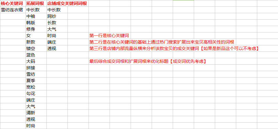 到这一步,词根基本拓展完成之后,可以把所有跟你宝贝高相关的词根罗列出来,做到excle表格中备用。然后再通过流量纵横将该款宝贝以往的成交词拆分成词根,罗列出来。最后综合成交词根和拓展词根来组合标题。成交词根优先考虑。(如果是新品没有成交数据,就不需要考虑这一点)